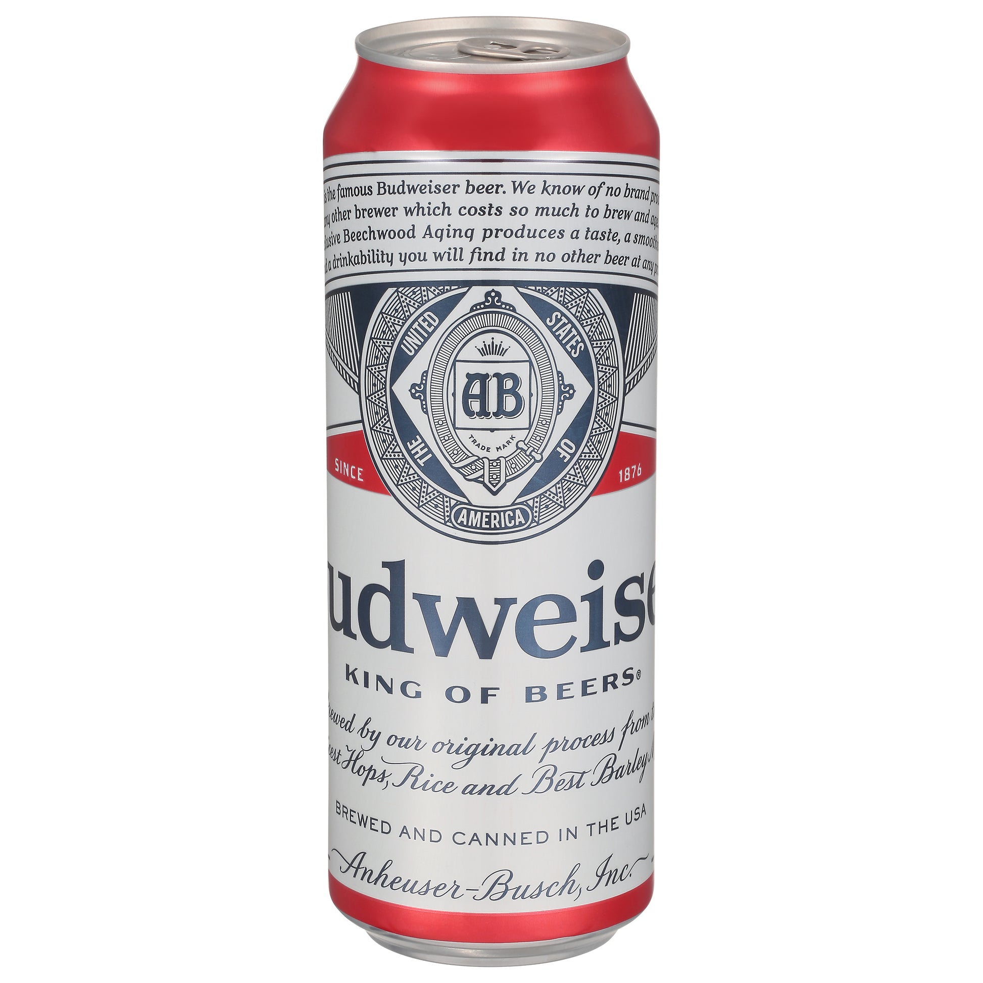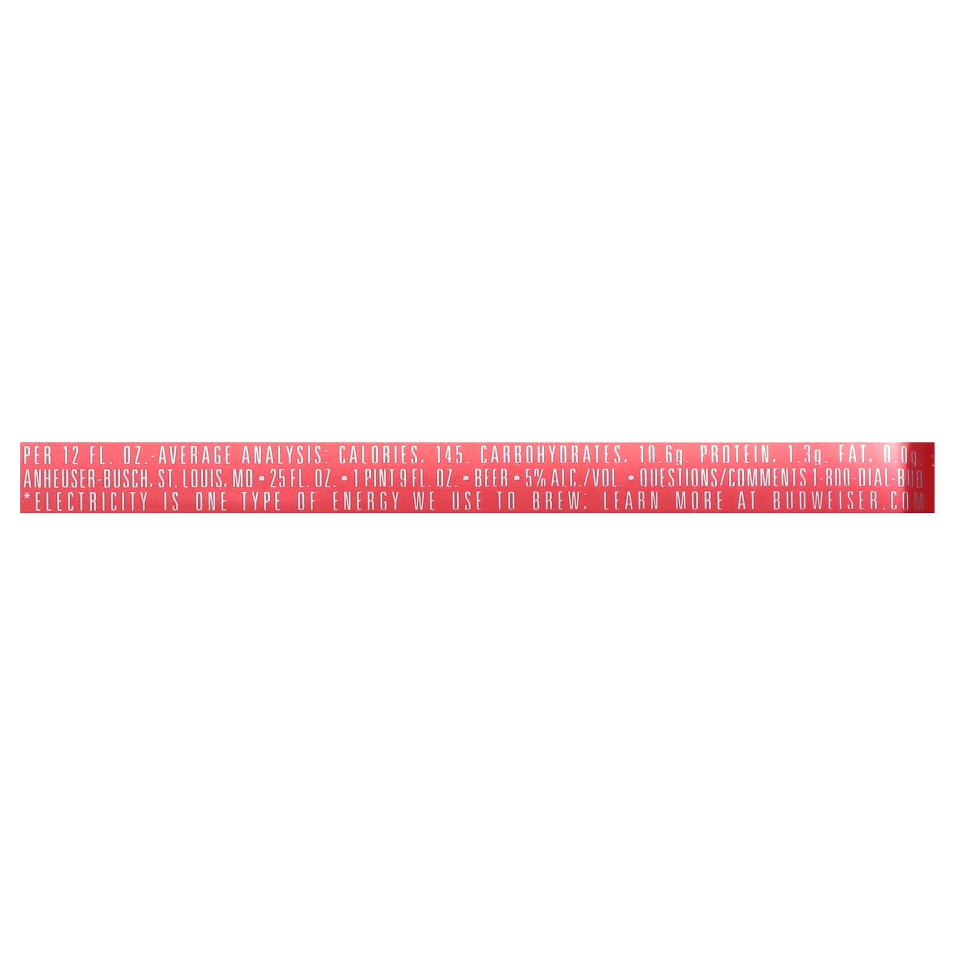 This is the famous Budweiser beer. We know of no brand produced by any other brewer which costs so much to brew and age. Our exclusive Beechwood Aging produces a taste, a smoothness and a drinkability you will find in no other beer at any price. King of beers. The great American. Since 1876. Genuine. King of beer. Brewed by our original process from the choicest hops, rice and best barley malt. Enjoy responsibly. Drink wiser. Brewed with renewable 100% electricity from wind power (Electricity is one type of energy we use to brew; Learn more at budweiser.com). Please recycle.