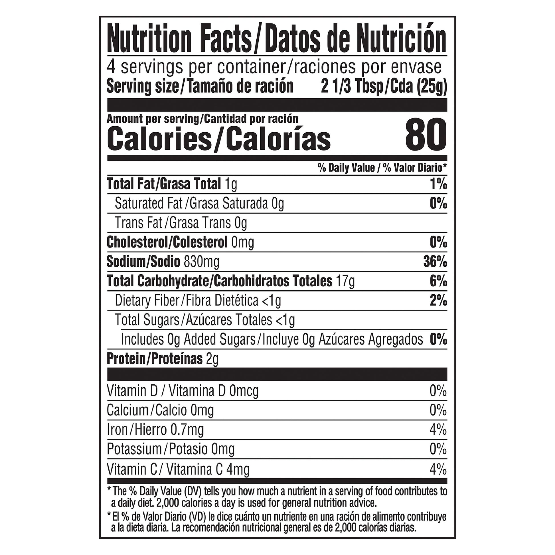 Serves 4. Naturally and artificially flavored. Per 2-1/3 Tbsp Serving Dry Mix: 80 calories; 0 g sat fat (0% DV); 830 mg sodium (36% DV); less than 1 g total sugars. Contains a bioengineered food ingredient. Since 1838. Our promise homemade flavor. learnaboutmyfood.com. how2recycle.info. Facebook. Like us (at)facebook/knorr. SmartLabel app enabled. Questions? Visit learnaboutmyfood.com. Question or comments? Give our kitchen a call! 1-800-457-7082. Product of Mexico.